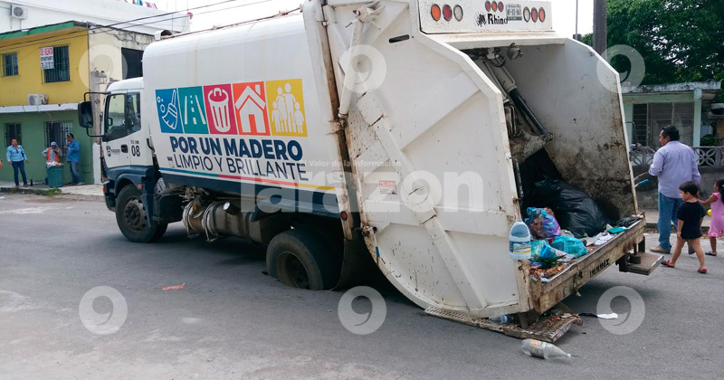 Camión de basura cae en un socavón en Ciudad Madero