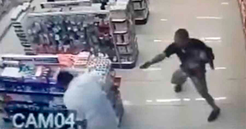 Enseguida, según muestra el video de las cámaras del circuito de seguridad, el policía, aún con su hijo en brazos, corrió hacia la parte delantera de la farmacia para disparar al otro asaltante.