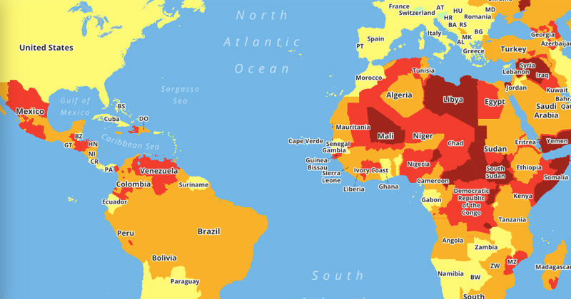 La compañía marca como destinos de viaje con “alto” nivel de riesgo (color rojo) a Venezuela, El Salvador, Honduras y Haití, el sur de Colombia, partes del territorio de México y Guatemala y Perú en América Latina. El rojo cubre también amplios territorios en África y Oriente Medio.