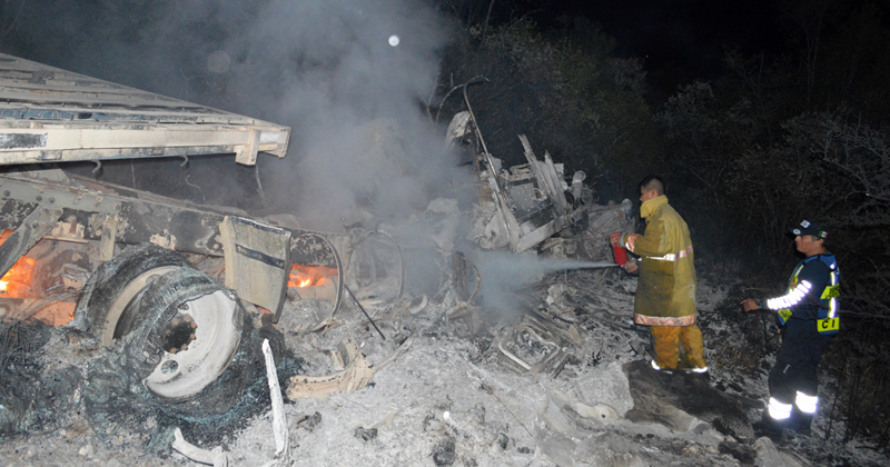 Aparentemente chofer dormita y al salirse del camino cae a un barranco de por lo menos 8 metros. Ante el golpe el camión se quemó