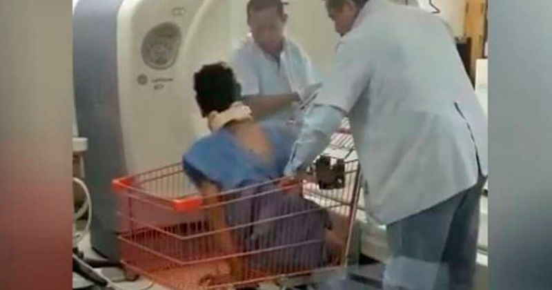 En el video se aprecia a dos enfermeros ayudando a subir al paciente al carrito de supermercado
