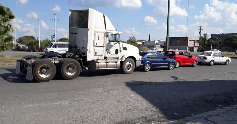 Aparentemente una falla mecánica hace que al chofer no le responda la pesada unidad, golpeando un Jetta que a su vez se proyecta contra otro coche compacto