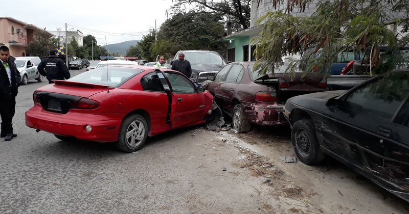 Taquero toma a exceso de velocidad una curva y al perder el control se estrella contra tres vehículos que estaban en un local mecánico