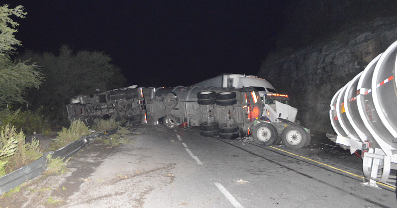 Pipa de doble remolque choca de frente contra otro camión y queda volcado, así como atravesado en la carretera. La velocidad y pavimento resbaladizo por el frío las causas
