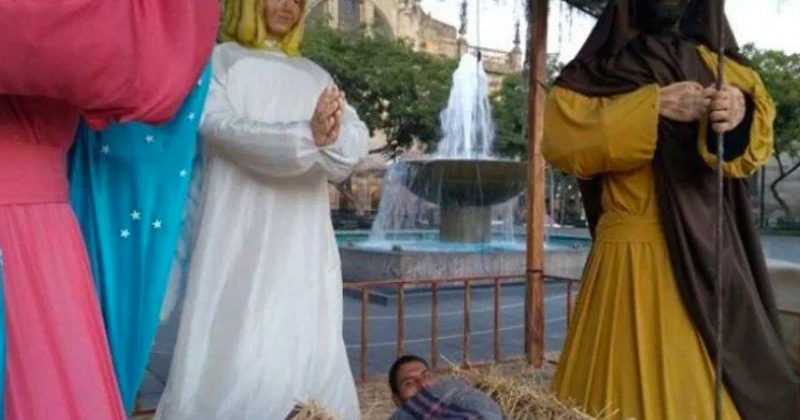 Indigente ocupa lugar del ‘Niño Dios’ en pesebre