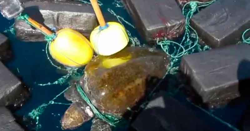 MÉXICO. La Guardia Costera de Estados Unidos encontró a una tortuga que estaba enredada con unas cuerdas, que a su vez sostenían paquetes de droga.