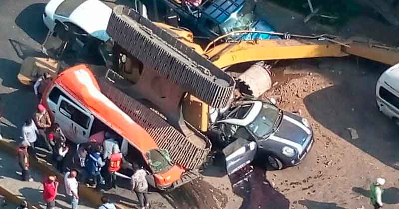 Una retroexcavadora cayó sobre varios vehículos en Vía Magna a la altura de Central Park, casi frente a Glorieta del Gato, en Interlomas