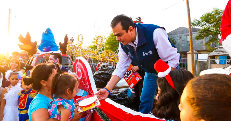 NUEVO LAREDO, Tam.- Cientos de niños y niñas disfrutaron la visita anticipada de Santa Claus y la entrega de regalos en la colonia Unión del Recuerdo y El Bayito, donde también acudió el presidente municipal Enrique Rivas para convivir con los habitantes del sector.
