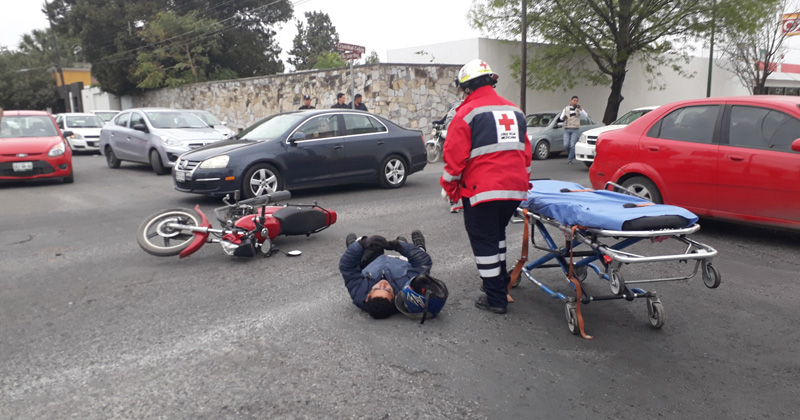 CIUDAD VICTORIA, Tamaulipas.- El empleado de una agencia automotriz resultó lesionado cuando al viajar a bordo de una motocicleta fue impactado de forma lateral por un vehículo oficial que instantes atrás había sido chocado por otro automóvil que rebasó el límite de alto.