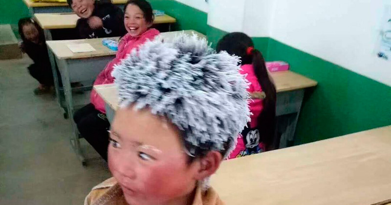 Niño llega a presentar exámenes con el pelo congelado