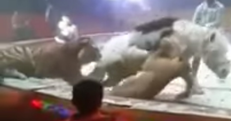 Un tigre y una leona atacan a un caballo en plena función de un circo (VIDEO)