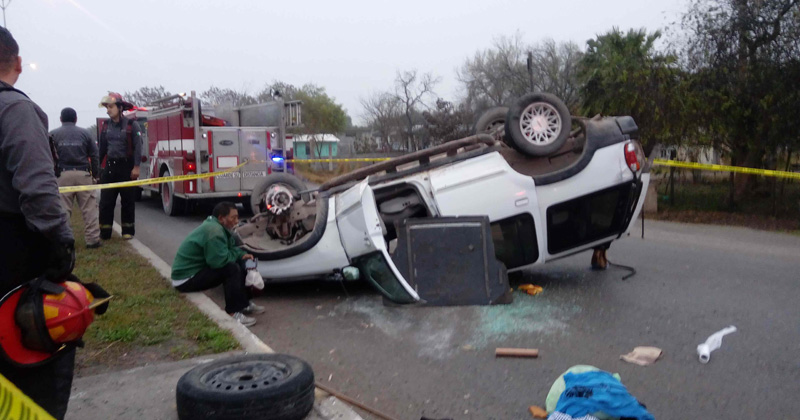 Viajaba en el asiento del copiloto de la camioneta que manejaba su marido; derrapan por pavimento húmedo, chocan contra el camellón y terminan volcados