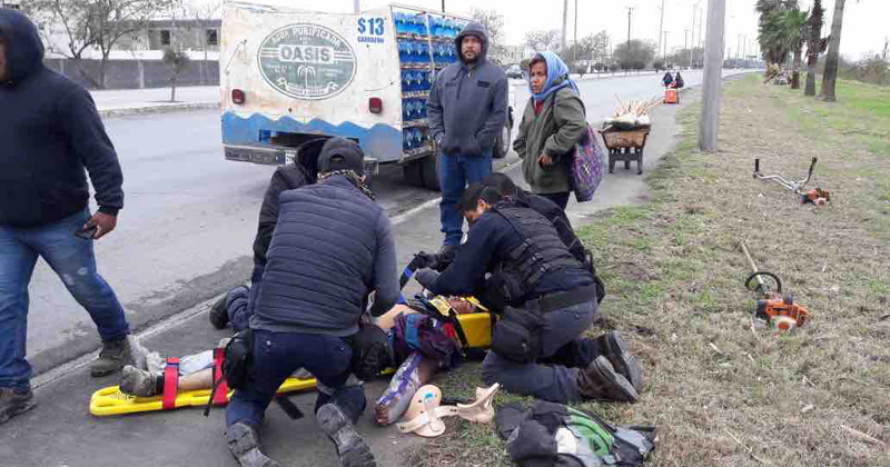 MATAMOROS, Tamaulipas.- Jardinero del Municipio hacía tareas de limpieza en la avenida Virgilio Garza Ruiz, se atraviesa y provoca que un camión de reparto de agua Oasis barra con con él varios metros hasta facturarle un brazo.