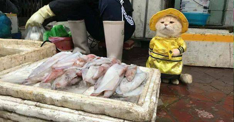 Gatito vende pescado en un mercado vietnamita