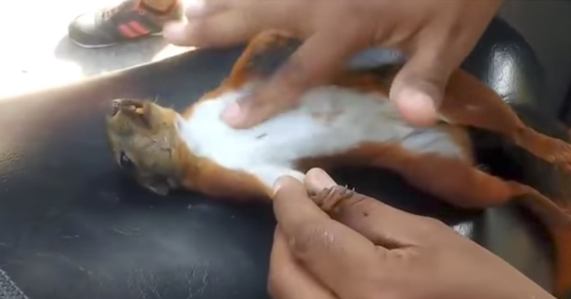 El hombre, tratando de revivir a la pequeña ardilla a cualquier costo, sostiene su cabeza para que la sangre pueda ser bombeada al cerebro, mientras le sopla aire en el hocico para ayudarla a respirar.