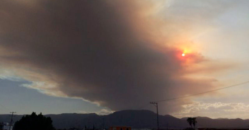 Los fuertes vientos del frente frío 44 que se dejaron sentir este sábado avivaron el fuego en Miquihuana, formando una enorme mancha griseásea y naranja que ocultó el sol del atardecer en Victoria