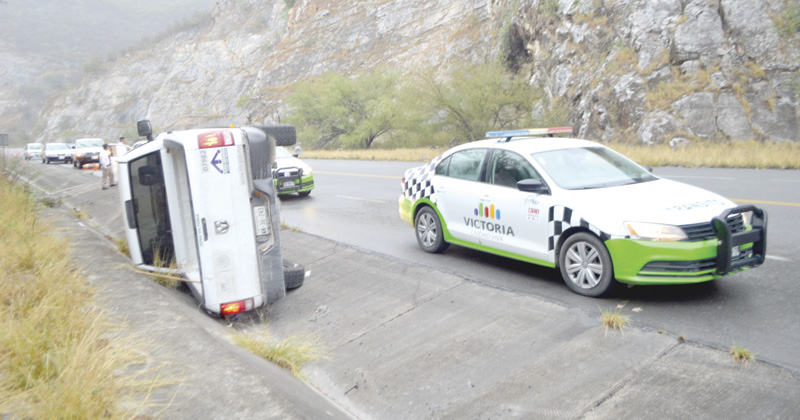 CIUDAD VICTORIA, Tamaulipas.- Un empleado de la Comisión Federal de Electricidad volcó la mañana de ayer en la carretera de Rumbo Nuevo debido a que perdió el control por la velocidad y el pavimento mojado que había en esos momentos.