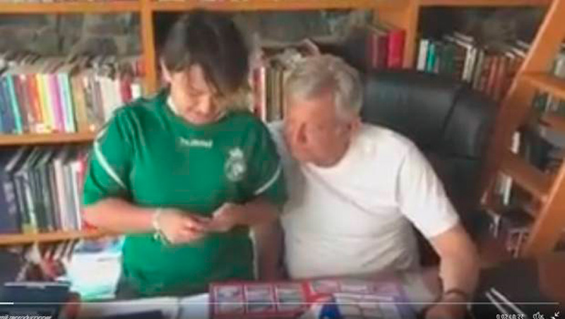 A un día del debate, AMLO ayuda a su hijo a pegar estampitas