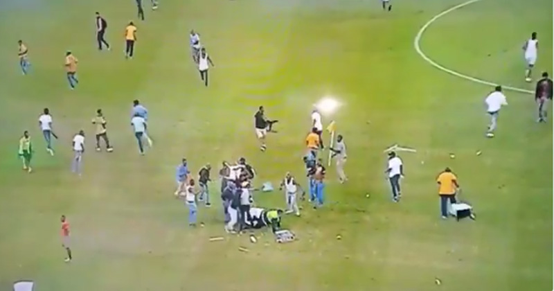 Decenas de aficionados enfurecidos invadieron el campo y comenzaron a destruir mobiliario técnico, del estadio, cámaras y a agredir a los oficiales que intentaban detenerlos