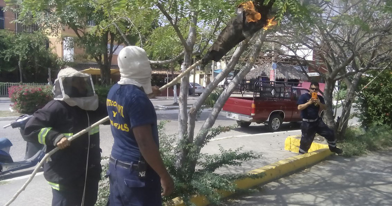 De acuerdo a los datos proporcionados al respecto se conoce que el enjambre de abejas se encontraba anidado en una llanta de tractor que estaba en el patio.