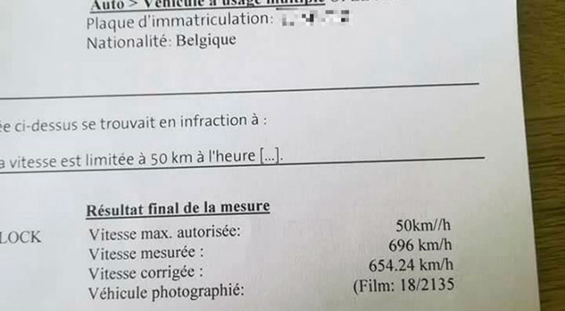 Según el documento de la policía belga, el flash del radar había saltado porque su coche atravesó el cercano municipio de Quiévrain a 696 km/h. Una vez corregido el margen de error del cinemómetro, la cifra oficial se redujo… a 654,24 km/h. Un inclumplimiento gravísimo del código de circulación, queda claro, más aún si se tiene en cuenta que el límite máximo en ese punto es de 50 km/h.
