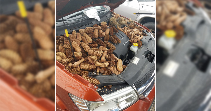 Ardillas esconden 23 kilos de piñas de pino en el motor de un coche