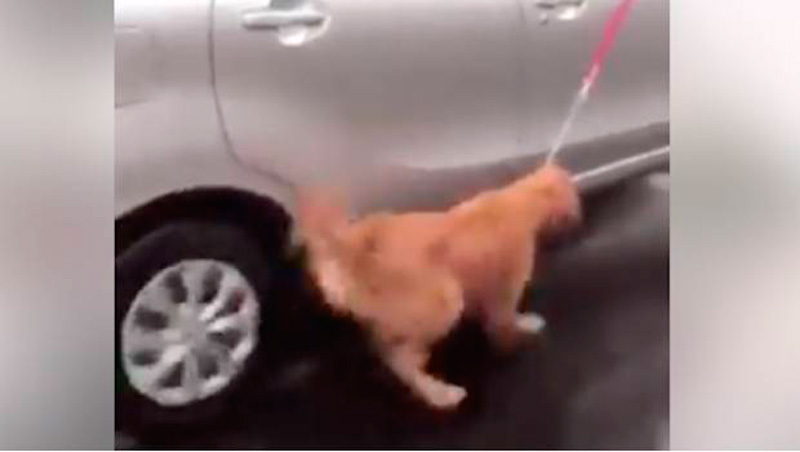 Amarran a su perro al auto y lo arrastran bajo la lluvia