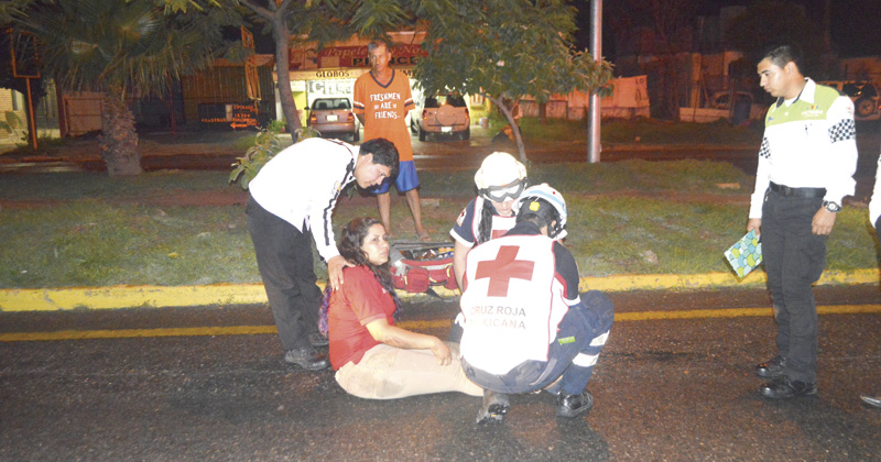 CIUDAD VICTORIA, Tamaulipas.- Técnicos en urgencias médicas de la Cruz Roja auxiliaron a una motociclista que resultó lesionada al derrapar debido a la velocidad y pavimento mojado.
