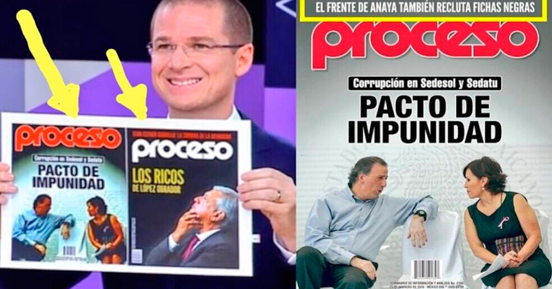 La lámina que utilizó Ricardo Anaya para contraatacar a López Obrador fue alterada para no mostrar un titular que hablaba de su campaña.
