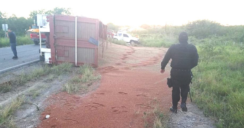 SAN FERNANDO, Tamaulipas.- Operador de unidad de carga que se desplazaba a exceso de velocidad, sin precaución alguna y bajo los efectos de las bebidas alcohólicas, ocasionó un accidente donde quedaron esparcidas 48 toneladas de sorgo que transportaba en el tráiler que conducía.