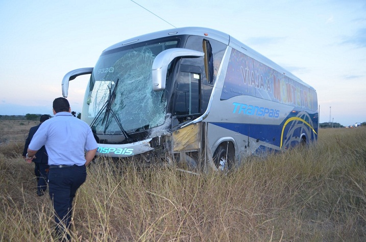 El autobús de pasajeros derrapo sobre la cinta asfáltica, presuntamente por existir un derramamiento de diésel que se extendió al registrarse una ligera lluvia, pero afortunadamente no hubo personas lesionadas.
