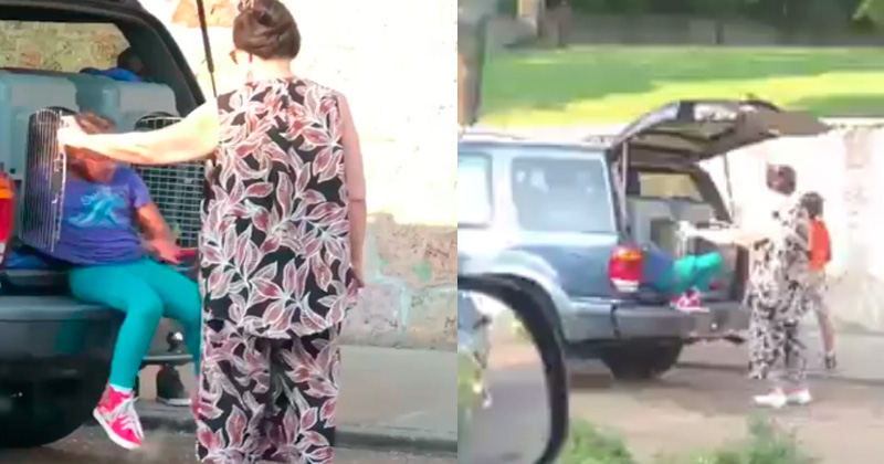 La escena fue captada por el conductor de un vehículo que pudo grabar cuando la abuela abría uno de los contenedores, que colocó en la parte trasera de su camioneta, para dejar salir a una niña