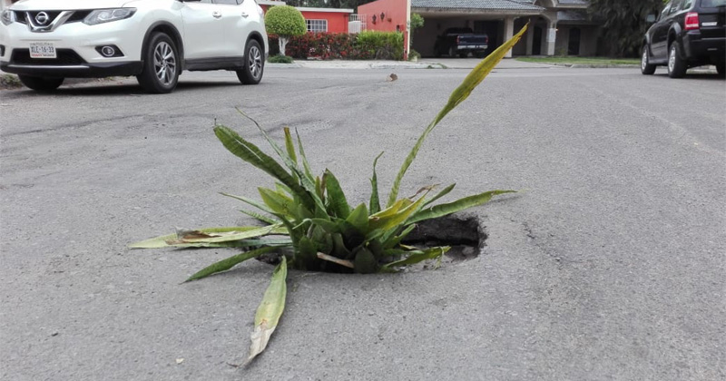 En la colonia Lázaro Cárdenas, los vecinos sembraron una planta en un bache para evitar que los automovilistas sufran un accidente.