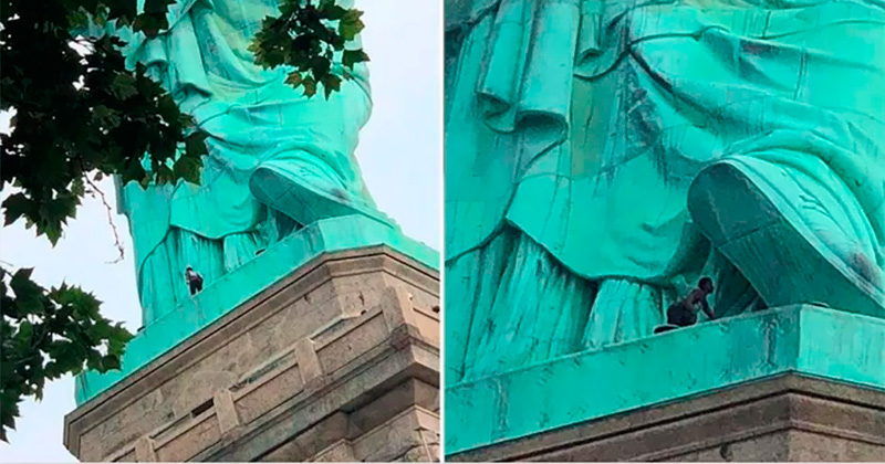 Mujer escala Estatua de la Libertad en protesta por políticas migratorias