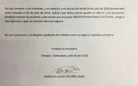 El documento está firmado por Treviño Unda quien originalmente era la candidata que se había registrado por el PES en la coalición «Juntos Haremos Historia»