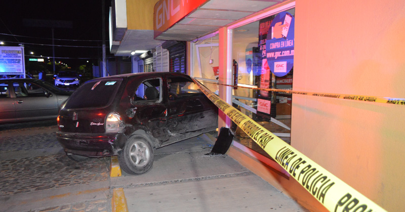 Por tratar de dar vuelta en “U”, lo impactan y lo proyectan contra un negocio de complementos energéticos ubicado frente a Soriana Palmas; dos personas resultan con heridas leves