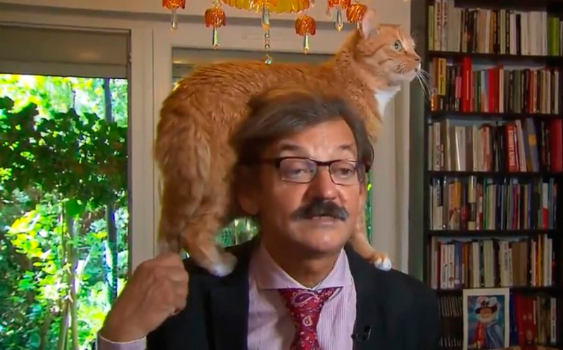 Mientras daba una entrevista a un medio internacional, el gato de un académico decidió que sería buena idea trepar los hombros de su dueño