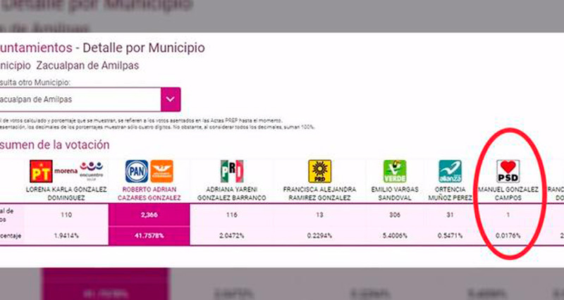 Sólo uno votó por González Campos, que representa 0.0176% de los sufragios