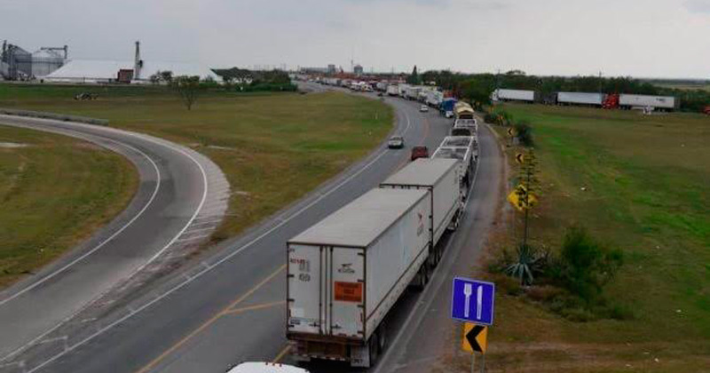 Unidades de transporte y vehículos particulares, forman largas filas.