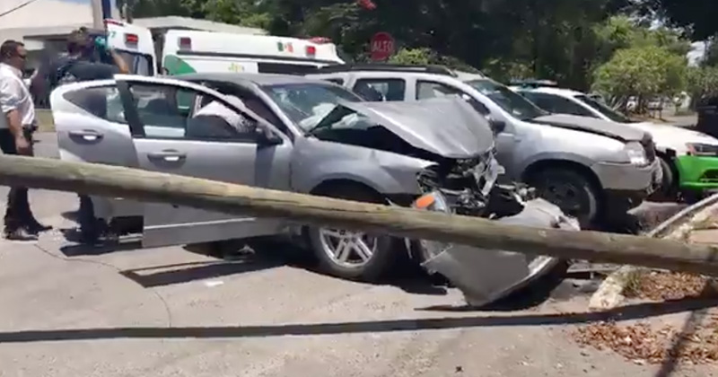 Persona prensada al derribar poste de TELMEX con su vehículo