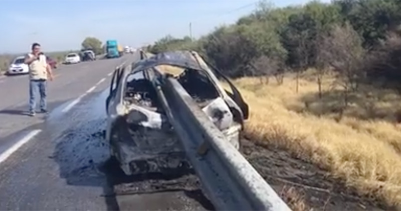 Carro se impacta con valla de contención y se incendia en el km.44 de la Carretera Zaragoza; un hombre y 2 mujeres fueron trasladados a #CdVictoria para su atención médica.