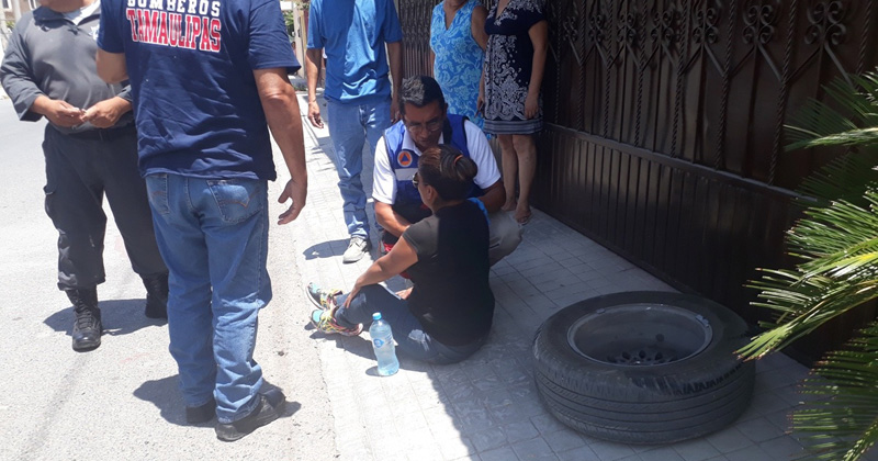 El neumático se desprendió de una camioneta en movimiento y golpea a la dama que caminaba sobre la banqueta en el fraccionamiento las Flores.