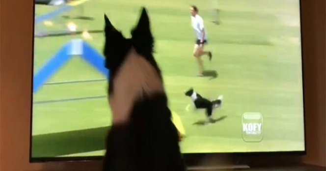 La border collie no puede contener su entusiasmo y salta de un lado a otro mientras se ve a sí misma participando en un concurso de habilidades caninas.