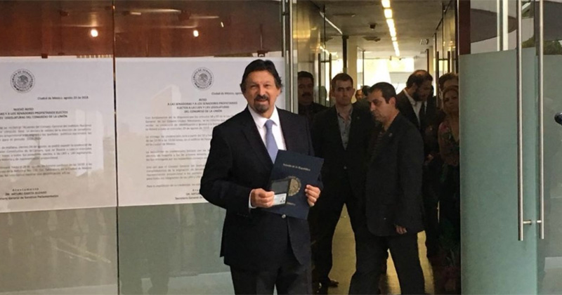 Napoleón Gómez Urrutia, líder del sindicato minero, se registró esta tarde ante el Senado de la República para la Sesión Constitutiva del 29 de agosto próximo.