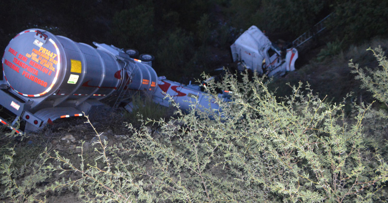 El chofer salió ileso luego de caer a un barranco en la carretera «Rumbo Nuevo». El combustible se derrama ligeramente y es controlado por Protección Civil.