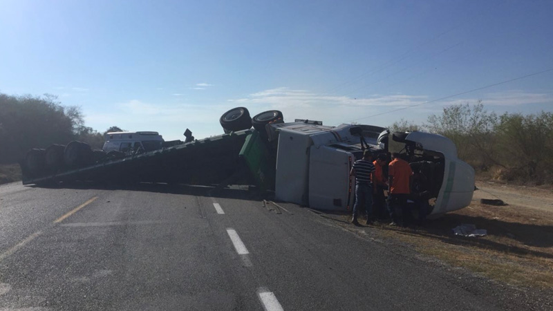 Un trailer cargado con toneladas de viga se volcó y queda atravesado en la carretera Victoria-Monterrey.