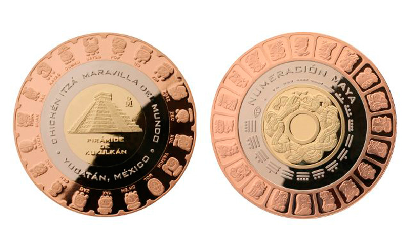 Las imágenes que circulan muestran una moneda con bordes cobrizos y un centro dorado con la imagen de la Pirámide de Kukulkán, y de igual manera muestra en el anverso la leyenda: “Chichen Itza maravilla del mundo”. Mientras que en el reverso se observa un aro marcador del juego de pelota adornado con dos serpientes y se muestra la numeración maya (del cero al 19).