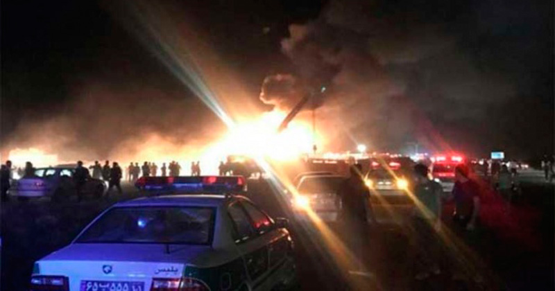Un autobús de pasajeros se incendia tras chocar contra uncamión cisterna en la carretera que une las ciudades de Kashan y Natanz