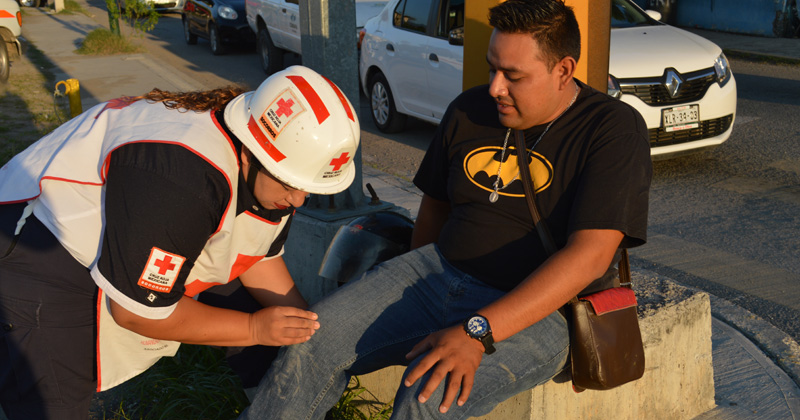 Empleado es atendido por la Cruz Roja al salir con un fuerte golpe en una pierna. Se dirigía a su trabajo cuando se estrella con una vagoneta.