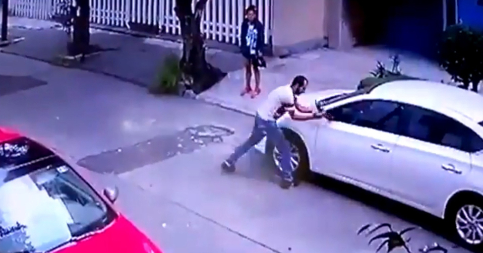 Un video muestra cuando la pareja se para junto a un coche blanco estacionado sobre la calle Minatitlán y se roba dos espejos retrovisores.